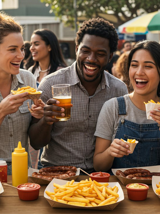 What makes us different? It’s not only the quality of our sausages – though they are world-class – it’s the entire atmosphere. Our stands are decorated in authentic Bavarian style: wood, blue-and-white patterns, pretzels, and traditional details that immediately transport you to a German beer garden. Our team wears Dirndl and Lederhosen, welcoming you with a smile and a taste of home.